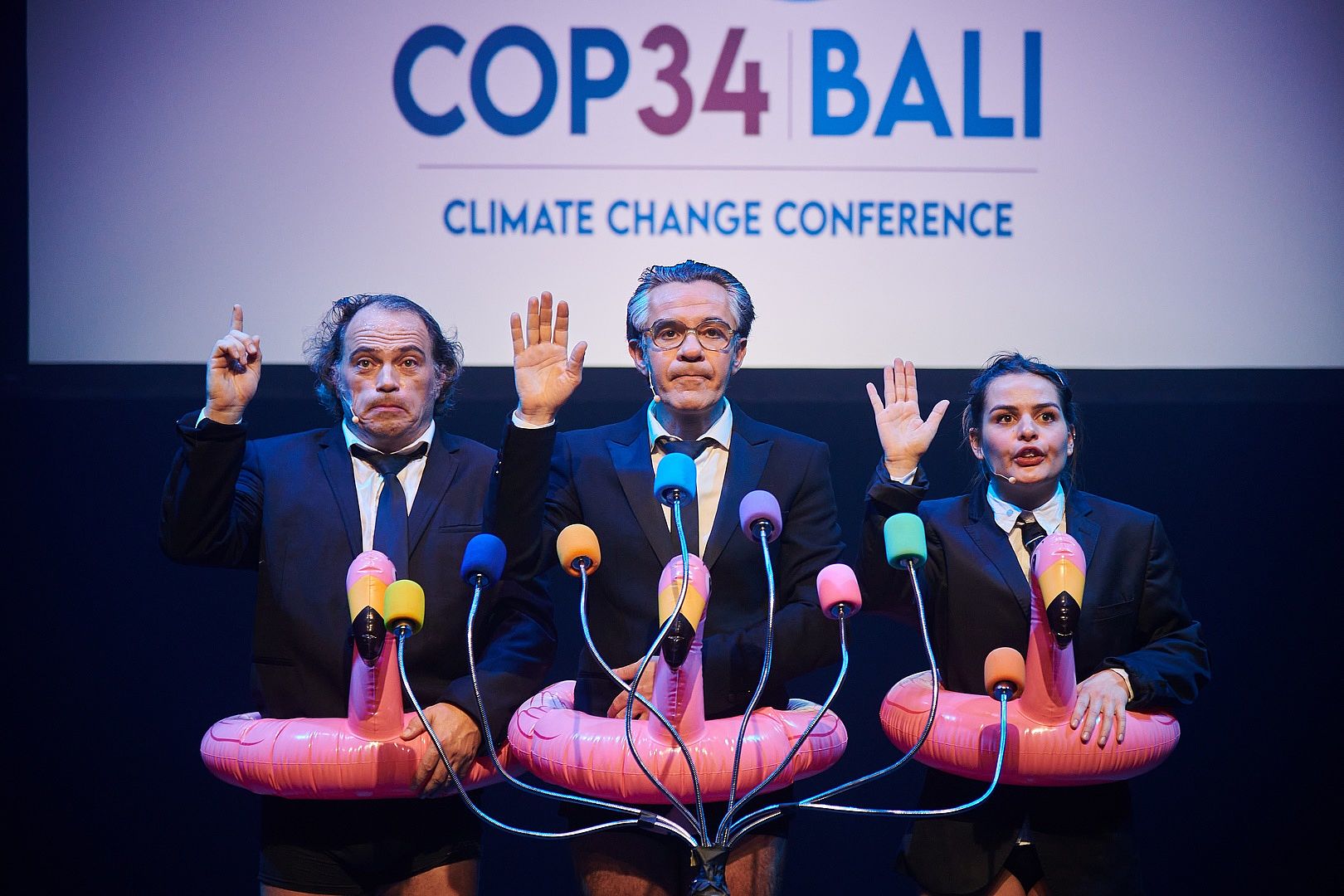 L’’idée qui nous a guidés a été d’éveiller les consciences sur les défis environnementaux qui nous attendent, en proposant ce que j’appellerais du musical-hall burlesque. Nous avons imaginé plusieurs tableaux, parmi lesquels le patinage artistique sur la banquise, un septième continent de plastique occupant le Pacifique nord ou encore la COP34 qui se déroulerait à Bali avec des participants arrivant en bouée. Le fil rouge est un enfant tombé du ciel, que nous accueillons pour lui présenter l’état du monde. Le grotesque permet de passer des messages et de montrer que, en un battement de cil, tout s’est accéléré depuis la Révolution industrielle.
